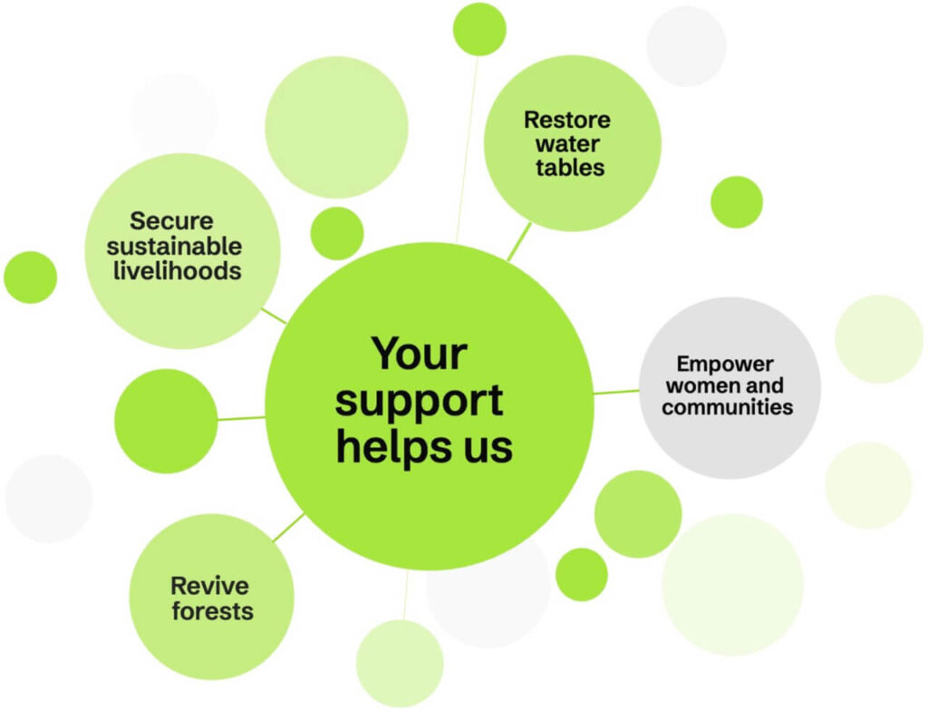Rising temperatures, erratic monsoons and degraded ecosystems are eroding rural livelihoods and pushing families into crowded cities. At Raintree Foundation, we believe climate, community, and biodiversity are inseparable. From restoring water and soil to strengthening local economies, every step builds resilience. Together, people, and nature thrive and hope returns.